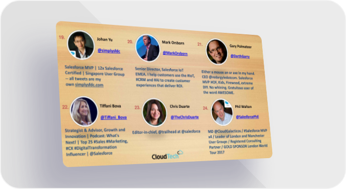 19. Johan Yu 20. Mark Orsborn 21. Gary Polmateer @simplysfdc @MarkOrsborn @DarthGarry Salesforce MVP | 12x Salesforce Senior Director, Salesforce IoT Either a mouse an or axe in my hand. Certified | Singapore User Group EMEA. I help customers use the #IoT, CEO@redargyledotcom. Salesforce -- all tweets are my #CRM and #AI to create customer MVP HOF, Kids, Firewood, extreme ownsimplysfdc.com experiences that deliver ROI. DIY. No whining. Gratuitous user of the word AWESOME. 22. Tiffani Bova 23. Chris Duarte 24. Phil Walton @Tiffani_Bova @TheChrisDuarte @SalesforcePhil Strategist & Advisor, Growth and Editor-in-chief, @trailheadat @salesforce MD@CloudGalacticos/#SalesforceMVP Innovation | Podcast: What's x4 / Leader of London and Manchester Next! | Top 25 #Sales #Marketing, User Groups / Registered Consulting #CX #DigitalTransformation Partner / GOLD SPONSOR London World Influencer | @Salesforce Tour 2017