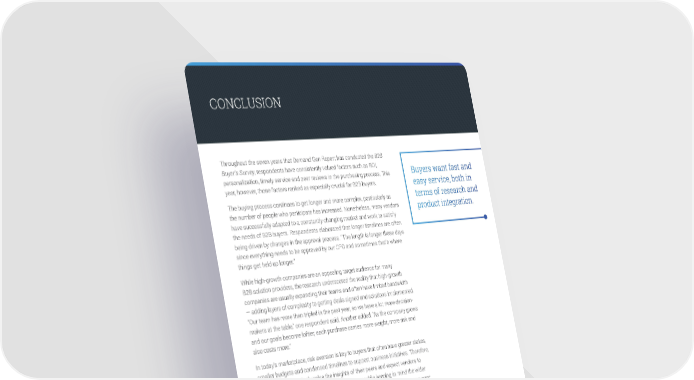 CONCLUSION Throughout the seven years that Demand Gen Report has conducted the B2B Buyer’s Survey, respondents have consistently valued factors such as ROI, Buyers want fast and personalization, timely service and peer reviews in the purchasing process. This year, however, those factors ranked as especially crucial for B2B buyers. easy service, both in The buying process continues to get longer and more complex, particularly as terms of research and the number of people who participate has increased. Nonetheless, many vendors product integration. have successfully adapted to a constantly changing market and work to satisfy the needs of B2B buyers. Respondents elaborated that longer timelines are often being driven by changes in the approval process. “The length is longer these days since everything needs to be approved by our CFO and sometimes that’s where things get held up longer.” While high-growth companies are an appealing target audience for many B2B solution providers, the research underscored the reality that high-growth companies are usually expanding their teams and often have limited bandwidth — adding layers of complexity to getting deals signed and solutions implemented. “Our team has more than tripled in the past year, so we have a lot more decision- makers at the table,” one respondent said. Another added: “As the company grows and our goals become loftier, each purchase carries more weight, more risk and also costs more.” In today’s marketplace, risk aversion is key to buyers that often have greater stakes, smaller budgets and condensed timelines to support business initiatives. Therefore, B2B buyers increasingly value the insights of their peers and expect vendors to understand the specific needs of their company, while keeping in mind the wider business landscape. When it comes to purchasing new technologies, buyers want fast and easy service, both in terms of research and product integration.