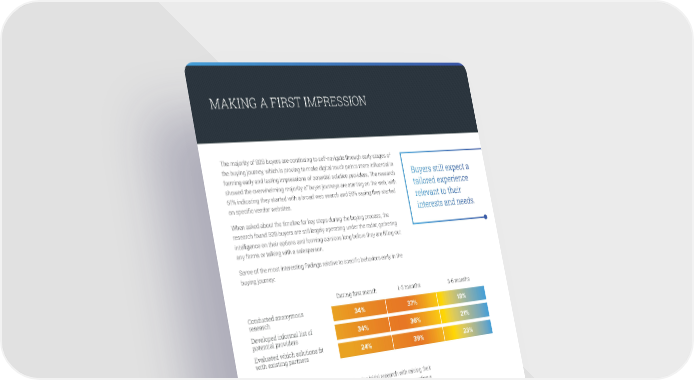 MAKING A FIRST IMPRESSION The majority of B2B buyers are continuing to self-navigate through early stages of the buying journey, which is proving to make digital touch points more influential in Buyers still expect a forming early and lasting impressions of potential solution providers. The research showed the overwhelming majority of buyer journeys are starting on the web, with tailored experience 61% indicating they started with a broad web search and 56% saying they started relevant to their on specific vendor websites. interests and needs. When asked about the timeline for key steps during the buying process, the research found B2B buyers are still largely operating under the radar, gathering intelligence on their options and forming opinions long before they are filling out any forms or talking with a salesperson. Some of the most interesting findings relative to specific behaviors early in the buying journey: During first month 1-3 months 3-6 months Conducted anonymous 34% 37% 18% research Developed informal list of 34% 36% 21% potential providers Evaluated which solutions fit 24% 39% 23% with existing partners Although a majority of B2B buyers are conducting initial research with raising their hand or officially engaging vendors, the research showed they are still expecting a tailored experience relevant to their interests and needs. When asked how first impressions of a brand were influenced during their initial visits to their website: • 75% said it was very important that the site presented relevant content that spoke directly to their company; • 66% said it was very important that the website spoke directly to the needs of their industry and the solution provider showed expertise in their area; and • 93% of respondents valued vendors that “demonstrated experience with/ knowledge of our industry.” 2017 B2B Buyer’s Survey Report • 5