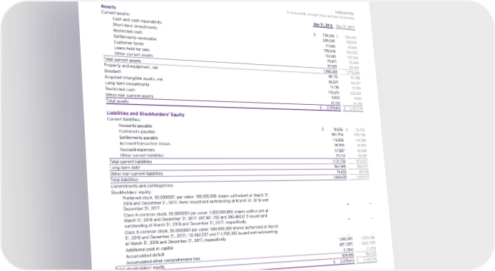 Consolidated Balance Sheets UNAUDITED In thousands, except share and per share data Assets Mar 31, 2018 Dec 31, 2017 Current assets: Cash and cash equivalents $ 738,586 $ 696,474 Short-term investments 200,048 169,576 Restricted cash 27,688 28,805 Settlements receivable 700,646 620,523 Customer funds 152,661 103,042 Loans held for sale 78,821 73,420 Other current assets 91,933 86,454 Total current assets 1,990,383 1,778,294 Property and equipment, net 98,170 91,496 Goodwill 58,327 58,327 Acquired intangible assets, net 14,138 14,334 Long-term investments 176,672 203,667 Restricted cash 9,802 9,802 Other non-current assets 32,120 31,350 Total assets $ 2,379,612 $ 2,187,270 Liabilities and Stockholders’ Equity Current liabilities: Accounts payable $ 19,556 $ 16,763 Customers payable 881,754 733,736 Settlements payable 116,902 114,788 Accrued transaction losses 28,309 26,893 Accrued expenses 57,997 52,280 Other current liabilities 27,214 28,367 Total current liabilities 1,131,732 972,827 Long-term debt 362,965 358,572 Other non-current liabilities 74,935 69,538 Total liabilities 1,569,632 1,400,937 Commitments and contingencies Stockholders’ equity: Preferred stock, $0.0000001 par value: 100,000,000 shares authorized at March 31, 2018 and December 31, 2017. None issued and outstanding at March 31, 2018 and December 31, 2017. — — Class A common stock, $0.0000001 par value: 1,000,000,000 shares authorized at March 31, 2018 and December 31, 2017; 287,921,742 and 280,400,813 issued and outstanding at March 31, 2018 and December 31, 2017, respectively. — — Class B common stock, $0.0000001 par value: 500,000,000 shares authorized at March 31, 2018 and December 31, 2017; 112,462,337 and 114,793,262 issued and outstanding at March 31, 2018 and December 31, 2017, respectively. — — Additional paid-in capital 1,682,581 1,630,386 Accumulated deficit (871,307) (842,735) Accumulated other comprehensive loss (1,294) (1,318) Total stockholders’ equity 809,980 786,333 Total liabilities and stockholders’ equity $ 2,379,612 $ 2,187,270 16