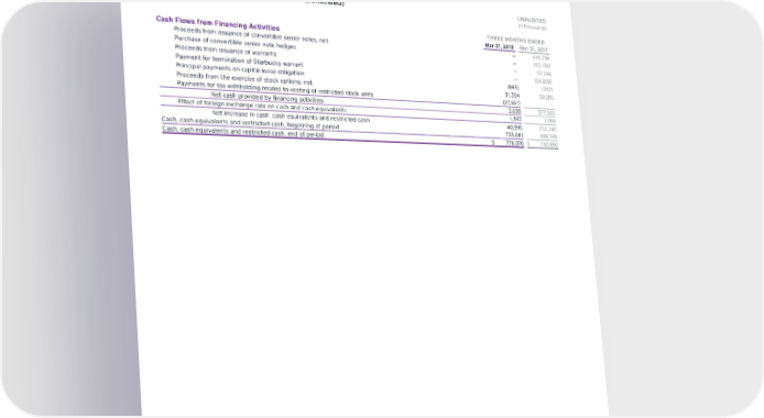 Consolidated Statements of Cash Flows (continued) UNAUDITED In thousands THREE MONTHS ENDED Cash Flows from Financing Activities Mar 31, 2018 Mar 31, 2017 Proceeds from issuance of convertible senior notes, net — 428,250 Purchase of convertible senior note hedges — (92,136) Proceeds from issuance of warrants — 57,244 Payment for termination of Starbucks warrant — (54,808) Principal payments on capital lease obligation (665) (247) Proceeds from the exercise of stock options, net 31,354 39,280 Payments for tax withholding related to vesting of restricted stock units (27,651) — Net cash provided by financing activities 3,038 377,583 Effect of foreign exchange rate on cash and cash equivalents 1,397 1,058 Net increase in cash, cash equivalents and restricted cash 40,995 252,245 Cash, cash equivalents and restricted cash, beginning of period 735,081 488,745 Cash, cash equivalents and restricted cash, end of period $ 776,076 $ 740,990 18