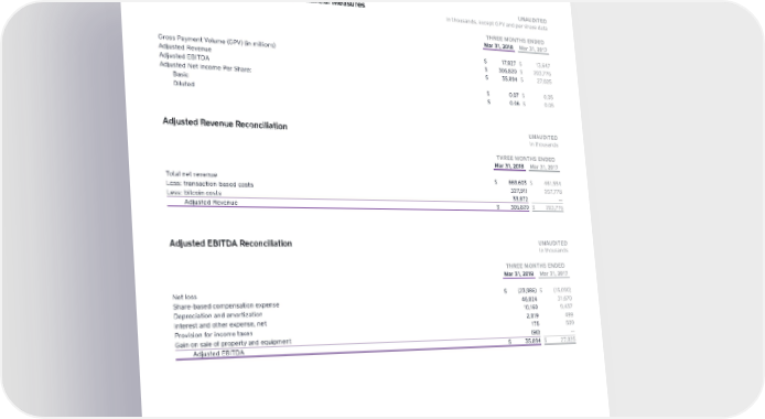 Key Operating Metrics and Non-GAAP Financial Measures UNAUDITED In thousands, except GPV and per share data THREE MONTHS ENDED Mar 31, 2018 Mar 31, 2017 Gross Payment Volume (GPV) (in millions) $ 17,827 $ 13,647 Adjusted Revenue $ 306,820 $ 203,776 Adjusted EBITDA $ 35,894 $ 27,025 Adjusted Net Income Per Share: Basic $ 0.07 $ 0.05 Diluted $ 0.06 $ 0.05 Adjusted Revenue Reconciliation UNAUDITED In thousands THREE MONTHS ENDED Mar 31, 2018 Mar 31, 2017 Total net revenue $ 668,603 $ 461,554 Less: transaction-based costs 327,911 257,778 Less: bitcoin costs 33,872 — Adjusted Revenue $ 306,820 $ 203,776 Adjusted EBITDA Reconciliation UNAUDITED In thousands THREE MONTHS ENDED Mar 31, 2018 Mar 31, 2017 Net loss $ (23,986) $ (15,090) Share-based compensation expense 46,824 31,670 Depreciation and amortization 10,160 9,437 Interest and other expense, net 2,819 499 Provision for income taxes 175 509 Gain on sale of property and equipment (98) — Adjusted EBITDA $ 35,894 $ 27,025 19