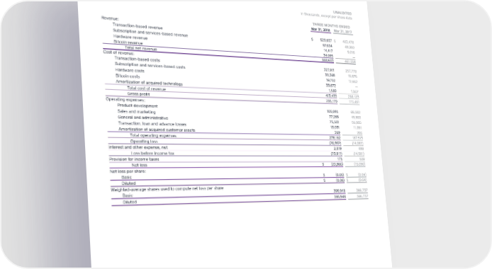 Consolidated Statements of Operations UNAUDITED In thousands, except per share data THREE MONTHS ENDED Mar 31, 2018 Mar 31, 2017 Revenue: Transaction-based revenue $ 523,037 $ 403,478 Subscription and services-based revenue 97,054 49,060 Hardware revenue 14,417 9,016 Bitcoin revenue 34,095 — Total net revenue 668,603 461,554 Cost of revenue: Transaction-based costs 327,911 257,778 Subscription and services-based costs 30,368 15,876 Hardware costs 19,702 12,662 Bitcoin costs 33,872 — Amortization of acquired technology 1,580 1,807 Total cost of revenue 413,433 288,123 Gross profit 255,170 173,431 Operating expenses: Product development 105,095 68,582 Sales and marketing 77,266 49,900 General and administrative 75,501 56,935 Transaction, loan and advance losses 18,031 11,891 Amortization of acquired customer assets 269 205 Total operating expenses 276,162 187,513 Operating loss (20,992) (14,082) Interest and other expense, net 2,819 499 Loss before income tax (23,811) (14,581) Provision for income taxes 175 509 Net loss $ (23,986) (15,090) Net loss per share: Basic $ (0.06) $ (0.04) Diluted $ (0.06) $ (0.04) Weighted-average shares used to compute net loss per share Basic 395,948 366,737 Diluted 395,948 366,737 15