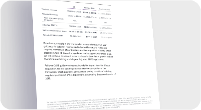 GUIDANCE: Q2 Current 2018 Previous 2018 Total net revenue $740M to $760M $3.00B to $3.06B $2.82B to $2.88B Adjusted Revenue $355M to $360M $1.40B to $1.43B $1.30B to $1.33B Year-over-year growth 49% 44% 34% (midpoint) Adjusted EBITDA $60M to $64M $240M to $250M $240M to $250M Net income (loss) per share $(0.04) to $(0.02) $(0.04) to $0.00 $(0.08) to $(0.04) Adjusted EPS (diluted) $0.09 to $0.11 $0.44 to $0.48 $0.43 to $0.47 Based on our results in the first quarter, we are raising our full-year guidance for total net revenue and Adjusted Revenue to reflect the ongoing momentum of our business and the acquisition of Zesty, which closed on April 19. Given the significant market opportunity ahead of us, we will continue to reinvest in our business to drive future growth and are therefore maintaining our full-year Adjusted EBITDA guidance. Full-year 2018 guidance does not include the impact from the Weebly acquisition. We will update guidance after the completion of the transaction, which is subject to customary closing conditions including regulatory approvals and is expected to close during the second quarter of 2018. We have not reconciled Adjusted EBITDA and Adjusted EPS guidance to their GAAP equivalents as a result of the uncertainty regarding, and the potential variability of, reconciling items such as share-based compensation expense and weighted-average fully diluted shares outstanding. Accordingly, a reconciliation of these non-GAAP guidance metrics to their corresponding GAAP equivalents is not available without unreasonable effort. However, we have provided a reconciliation of GAAP to non-GAAP metrics in tables at the end of this letter. It is important to note that the actual amount of such reconciling items would have a significant impact if they were included in our Adjusted EBITDA and Adjusted EPS. 10