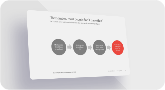 “Remember, most people don’t have that” For 25 years, we’ve had to remind ourselves that most people are not early adopters Most people Most people Most people 83% of US don’t have don’t have don’t have teenagers broadband 3G smartphones have an iPhone Source: Piper Jaffray for US teenagers in 2019 Benedict Evans –– January 2020 52