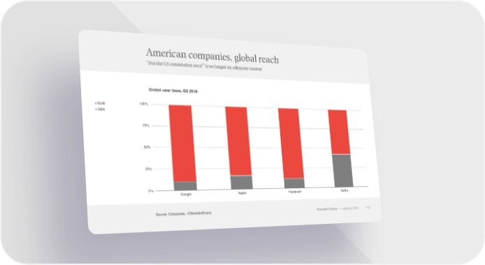 American companies, global reach “But the US constitution says!” is no longer an adequate answer Global user base, Q3 2019 RoW 100% USA 75% 50% 25% 0% Google Apple Facebook Netflix Source: Companies, @BenedictEvans Benedict Evans –– January 2020 107