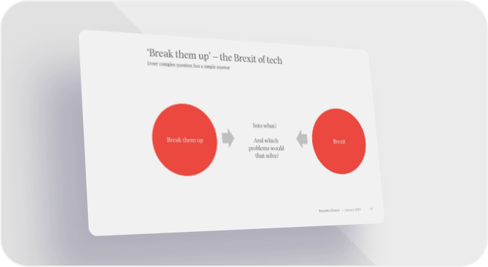 ‘Break them up’ –the Brexit of tech Every complex question has a simple answer Into what? Break them up And which Brexit problems would that solve? Benedict Evans –– January 2020 73