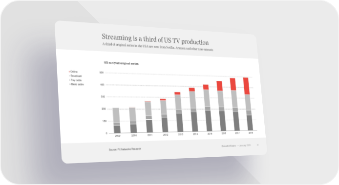 Streaming is a third of US TV production A third of original series in the USA are now from Netflix, Amazon and other new entrants US scripted original series Online 500 Broadcast Pay cable Basic cable 400 300 200 100 0 2009 2010 2011 2012 2013 2014 2015 2016 2017 2018 Source: FX Networks Research Benedict Evans –– January 2020 41