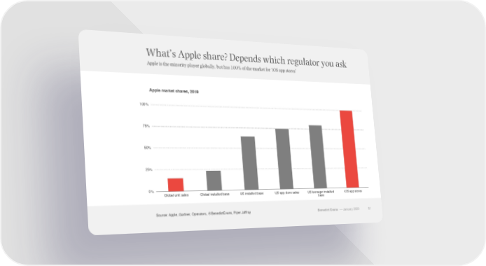 What’s Apple share? Depends which regulator you ask Apple is the minority player globally, but has 100% of the market for ‘iOS app stores’ Apple market shares, 2019 100% 75% 50% 25% 0% Global unit sales Global installed base US installed base US app store sales US teenager installed iOS app stores base Source: Apple, Gartner, Operators, @BenedictEvans, Piper Jaffray Benedict Evans –– January 2020 81