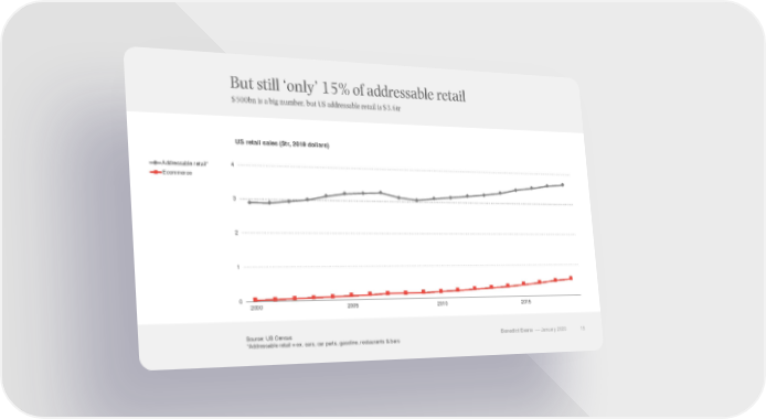 But still ‘only’ 15% of addressable retail $500bn is a big number, but US addressable retail is $3.6tr US retail sales ($tr, 2019 dollars) Addressable retail* 4 Ecommerce 3 2 1 0 2000 2005 2010 2015 Source: US Census Benedict Evans –– January 2020 15 *Addressable retail = ex. cars, car parts, gasoline, restaurants & bars