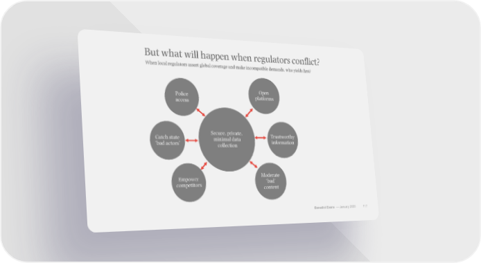 But what will happen when regulators conflict? When local regulators assert global coverage and make incompatible demands, who yields first? Police Open access platforms Catch state Secure, private, Trustworthy ‘bad actors’ minimal data information collection Empower Moderate competitors ‘bad’ content Benedict Evans –– January 2020 117