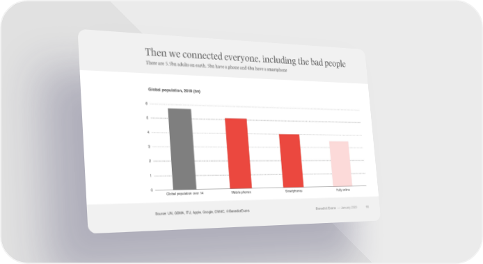 Then we connected everyone, including the bad people There are 5.5bn adults on earth, 5bn have a phone and 4bn have a smartphone Global population, 2019 (bn) 6 5 4 3 2 1 0 Global population over 14 Mobile phones Smartphones Fully online Source: UN, GSMA, ITU, Apple, Google, CNNIC, @BenedictEvans Benedict Evans –– January 2020 68