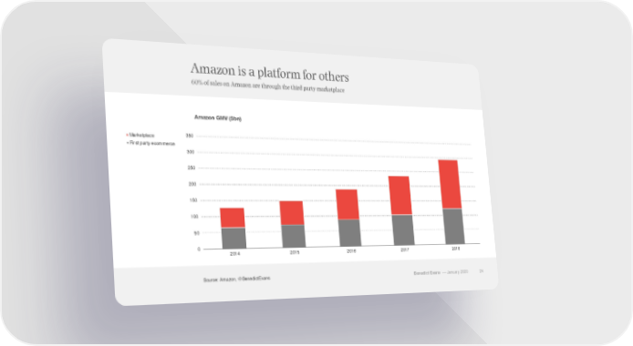 Amazon is a platform for others 60% of sales on Amazon are through the third party marketplace Amazon GMV ($bn) Marketplace 350 First party ecommerce 300 250 200 150 100 50 0 2014 2015 2016 2017 2018 Source: Amazon, @BenedictEvans Benedict Evans –– January 2020 24