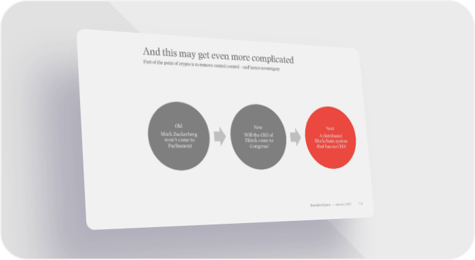 And this may get even more complicated Part of the point of crypto is to remove central control – and hence sovereignty Old New Next Mark Zuckerberg Will the CEO of A distributed won’t come to Tiktokcome to Blockchain system Parliament Congress? that has no CEO? Benedict Evans –– January 2020 118