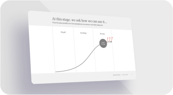 2020 Ben Evans at Davos Page 4 Page 6At this stage, we ask how we can use it… What becomes possible now that smartphones are mature and widely deployed? Stupid Exciting! Boring Smart Phones Benedict Evans –– January 2020 5