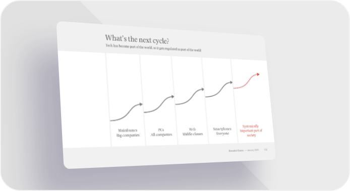 What’s the next cycle? Tech has become part of the world, so it gets regulated as part of the world Mainframes PCs Web Smartphones Systemically Big companies All companies Middle-classes Everyone important part of society Benedict Evans –– January 2020 122
