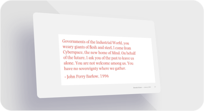 Governments of the Industrial World, you weary giants of flesh and steel, I come from Cyberspace, the new home of Mind. On behalf of the future, I ask you of the past to leave us alone. You are not welcome among us. You have no sovereignty where we gather. - John Perry Barlow, 1996 Benedict Evans –– January 2020 67