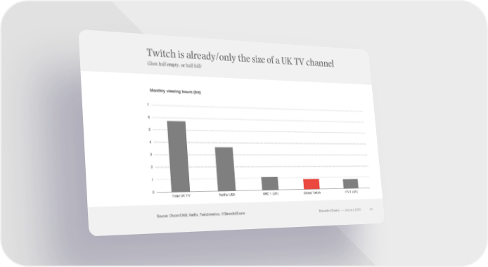 Twitch is already/only the size of a UK TV channel Glass half empty, or half full? Monthly viewing hours (bn) 7 6 5 4 3 2 1 0 Total UK TV Netflix USA BBC 1 (UK) Global Twitch ITV 1 (UK) Source: Ofcom/ONS, Netflix, Twitchmetrics, @BenedictEvans Benedict Evans –– January 2020 44