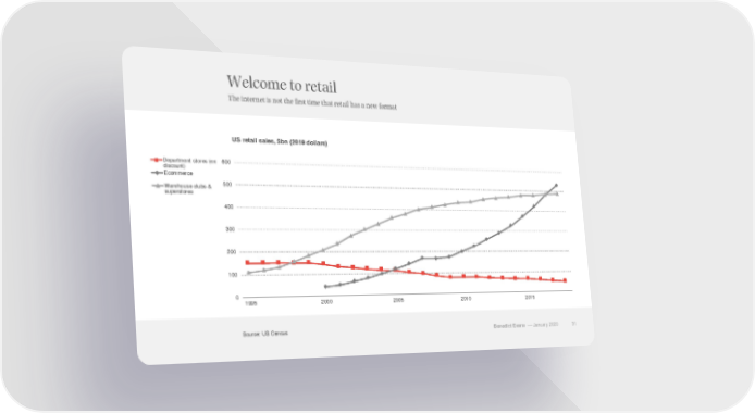 Welcome to retail The internet is not the first time that retail has a new format US retail sales, $bn (2019 dollars) Department stores (ex 600 discount) Ecommerce Warehouse clubs & 500 superstores 400 300 200 100 0 1995 2000 2005 2010 2015 Source: US Census Benedict Evans –– January 2020 31