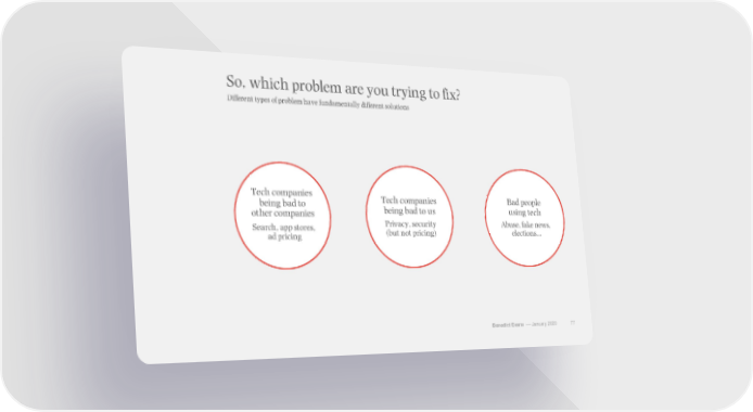 So, which problem are you trying to fix? Different types of problem have fundamentally different solutions Tech companies Tech companies Bad people being bad to being bad to us using tech other companies Search, app stores, Privacy, security Abuse, fake news, ad pricing (but not pricing) elections… Benedict Evans –– January 2020 77