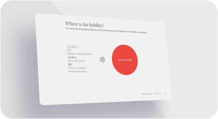 Where is the liability? In a massively disaggregated industry, there are many parties that might touch a problem at some point Landlord IRS Market counterparties Auditor Bernie Madoff Microsoft Excel SEC Phone company Suspicious peers Benedict Evans –– January 2020 92