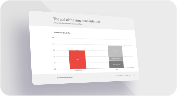The end of the American internet 40% of global ecommerce value is in China Ecommerce ($tr, 2019e) 2.5 2.0 1.5 India All other 1.0 China Western Europe 0.5 North America 0.0 China & India Other Source: McKinsey, eMarketer Benedict Evans –– January 2020 106