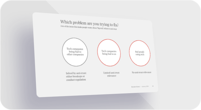 Which problem are you trying to fix? Few of the issues that make people worry about ‘big tech’ relate to anti-trust Tech companies Tech companies Bad people being bad to being bad to us using tech other companies Solved by anti-trust: Limited anti-trust No anti-trust relevance either breakups or relevance conduct regulation Benedict Evans –– January 2020 86