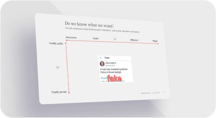 Do we know what we want? We lack consensus on what’s bad enough to ‘take down’, and on what ‘take down’ even means Innocuous Rude? ??? Offensive? Illegal Totally public ??? Totally private Benedict Evans –– January 2020 101