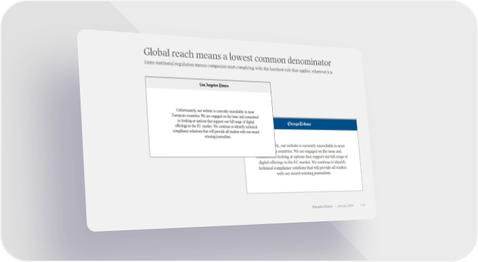 2020 Ben Evans at Davos Page 109 Page 111Global reach means a lowest common denominator Extra-territorial regulation means companies start complying with the harshest rule that applies, wherever it is Benedict Evans –– January 2020 110