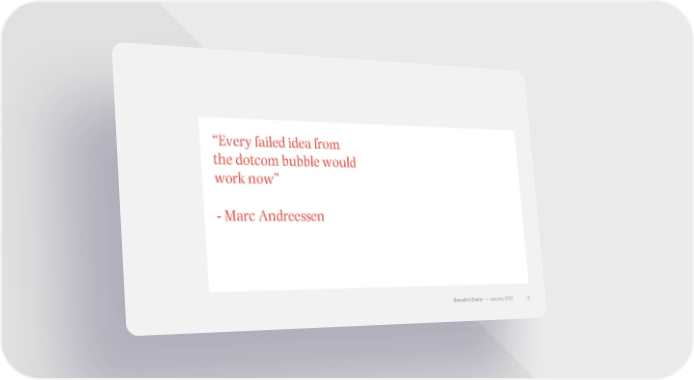 “Every failed idea from the dotcom bubble would work now” - Marc Andreessen Benedict Evans –– January 2020 12