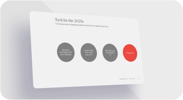 Tech for the 2020s A lot of innovation is happening inside tech, but that’s no longer the only focus Machine Crypto is the AR is the next learning is the new open smartphone Regulation new database source (?) (?) Benedict Evans –– January 2020 65