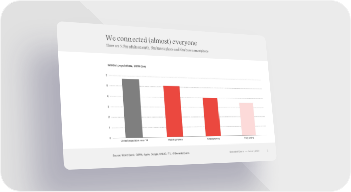 We connected (almost) everyone There are 5.5bn adults on earth, 5bn have a phone and 4bn have a smartphone Global population, 2019 (bn) 6 5 4 3 2 1 0 Global population over 14 Mobile phones Smartphones Fully online Source: World Bank, GSMA, Apple, Google, CNNIC, ITU, @BenedictEvans Benedict Evans –– January 2020 2