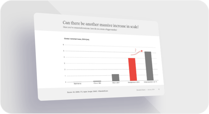 Can there be another massive increase in scale? Once you’ve connected everyone, how do you create a bigger market? Global installed base, 2019 (bn) 6 ? 5 4 3 2 1 0 Mainframes PCs in 1994 Web in 2007 Smartphones in 2019 Global population over 14 Source: UN, GSMA, ITU, Apple, Google, CNNIC, @BenedictEvans Benedict Evans –– January 2020 62