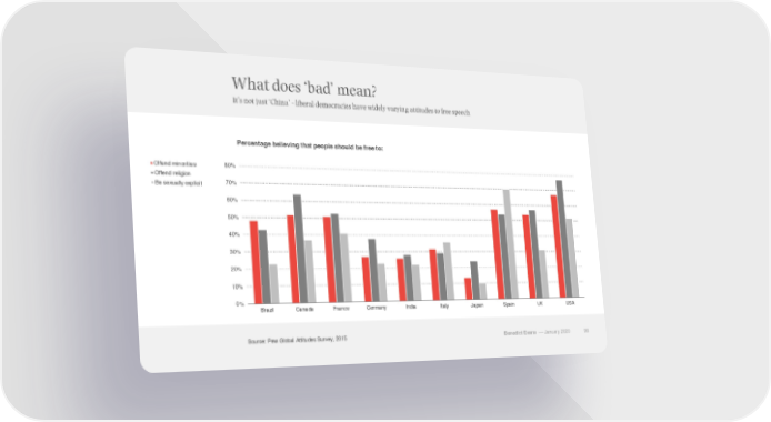 What does ‘bad’ mean? It’s not just ‘China’ - liberal democracies have widely varying attitudes to free speech Percentage believing that people should be free to: Offend minorities 80% Offend religion Be sexually explicit 70% 60% 50% 40% 30% 20% 10% 0% Brazil Canada France Germany India Italy Japan Spain UK USA Source: Pew Global Attitudes Survey, 2015 Benedict Evans –– January 2020 99