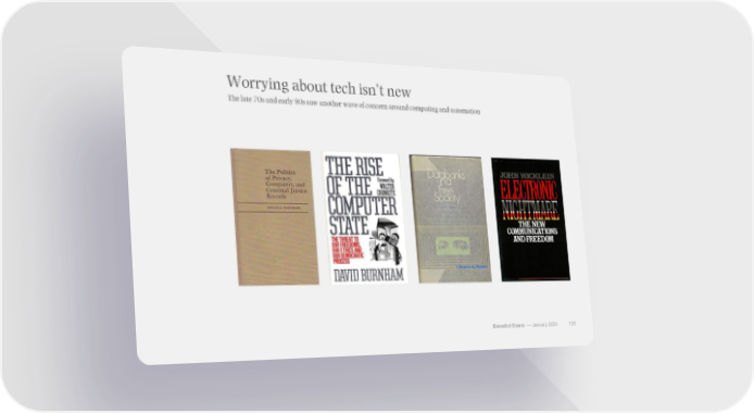 Worrying about tech isn’t new The late 70s and early 80s saw another wave of concern around computing and automation Benedict Evans –– January 2020 123