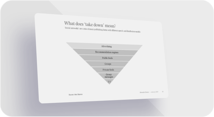 What does ‘take down’ mean? ‘Social networks’ are a mix of many publishing forms with different speech and distribution models Advertising Recommendation engines Public feeds Groups Private feeds Group messages 1:1 Source: Alex Stamos Benedict Evans –– January 2020 98