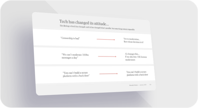 Tech has changed its attitude… The ideology of tech has changed, and AI has changed what’s possible, but some things remain impossible “Censorship is bad” Yes to moderation… But whose decision is it? “We can’t moderate 100bn AI changes this… messages a day” If we also hire 30k human moderators “You can’t build a secure You can’t build a secure platform with a back door” platform with a back door Benedict Evans –– January 2020 125