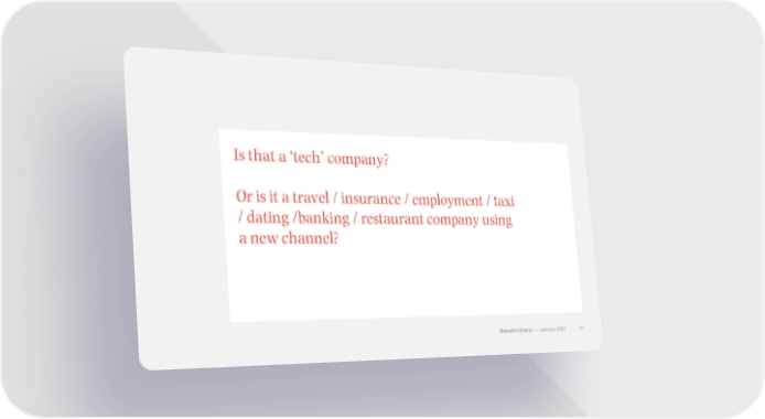 2020 Ben Evans at Davos Page 56 Page 58Is that a ‘tech’ company? Or is it a travel / insurance / employment / taxi / dating /banking / restaurant company using a new channel? Benedict Evans –– January 2020 57