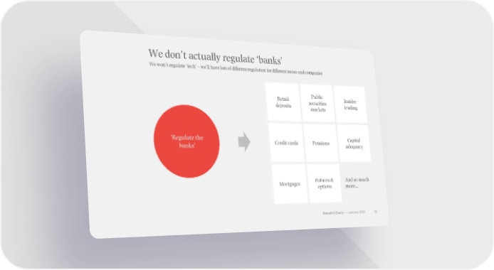 We don’t actually regulate ‘banks’ We won’t regulate ‘tech’ – we’ll have lots of different regulation for different issues and companies Retail Public Insider deposits securities trading markets ‘Regulate the Credit cards Pensions Capital banks’ adequacy Mortgages Futures & And so much options more… Benedict Evans –– January 2020 89
