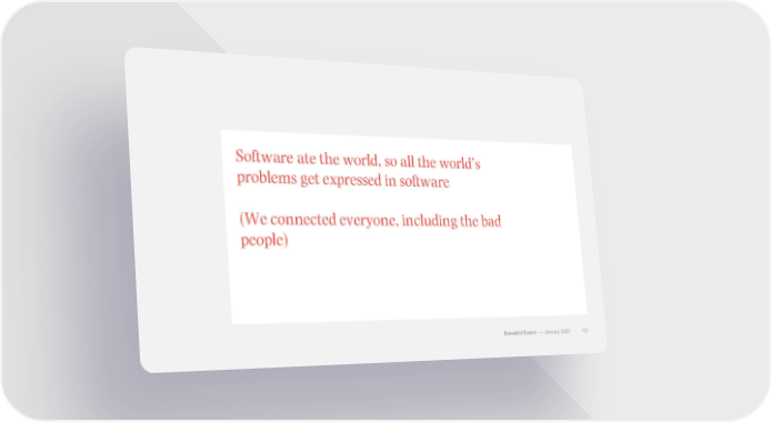 Software ate the world, so all the world’s problems get expressed in software (We connected everyone, including the bad people) Benedict Evans –– January 2020 121