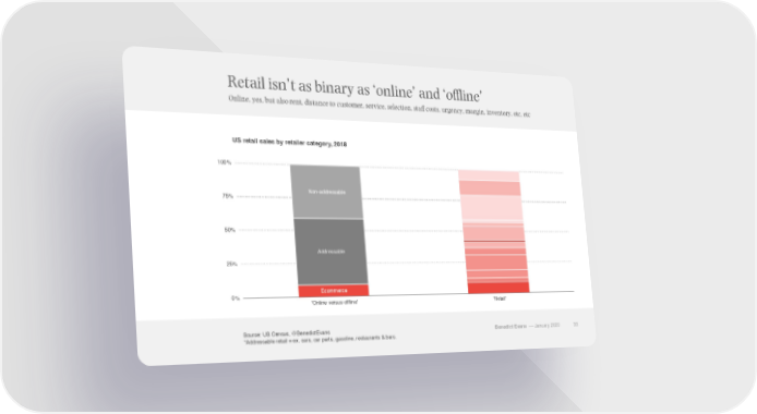 Retail isn’t as binary as ‘online’ and ‘offline’ Online, yes, but also rent, distance to customer, service, selection, staff costs, urgency, margin, inventory, etc, etc US retail sales by retailer category, 2018 100% 75% Non-addressable 50% Addressable 25% 0% Ecommerce 'Online versus offline' 'Retail' Source: US Census, @BenedictEvans Benedict Evans –– January 2020 33 *Addressable retail = ex. cars, car parts, gasoline, restaurants & bars.