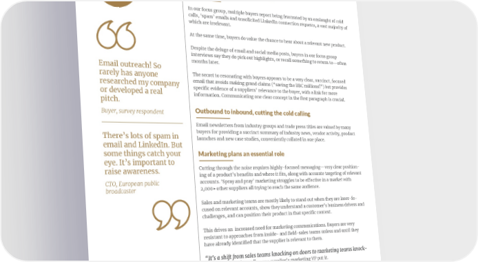 IN PARTNERSHIP WITH MARKETING MEDIA TECHNOLOGY Outbound to inbound, 04. cutting the cold calling In our focus group, multiple buyers report being frustrated by an onslaught of cold calls, ‘spam’ emails and unsolicited LinkedIn connection requests, a vast majority of which are irrelevant. At the same time, buyers do value the chance to hear about a relevant new product. Despite the deluge of email and social media posts, buyers in our focus group interviews say they do pick out highlights, or recall something to return to—often months later. Email outreach! So rarely has anyone The secret to resonating with buyers appears to be a very clear, succinct, focused researched my company email that avoids making grand claims (“saving the BBC millions!”) but provides or developed a real specific evidence of a suppliers’ relevance to the buyer, with a link for more information. Communicating one clear concept in the first paragraph is crucial. pitch. Buyer, survey respondent Outbound to inbound, cutting the cold calling Email newsletters from industry groups and trade press titles are valued by many buyers for providing a succinct summary of industry news, vendor activity, product There’s lots of spam in launches and new case studies, conveniently collated in one place. email and LinkedIn. But some things catch your Marketing plans an essential role eye. It’s important to Cutting through the noise requires highly-focused messaging—very clear position- raise awareness. ing of a product’s benefits and where it fits, along with accurate targeting of relevant CTO, European public accounts. ‘Spray and pray’ marketing struggles to be e昀昀ective in a market with broadcaster 2,000+ other suppliers all trying to reach the same audience. Sales and marketing teams are mostly likely to stand out when they are laser-fo- cused on relevant accounts, show they understand a customer’s business drivers and challenges, and can position their product in that specific context. This drives an increased need for marketing communications. Buyers are very resistant to approaches from inside- and field-sales teams unless and until they have already identified that the supplier is relevant to them. “It’s a shift from sales teams knocking on doors to marketing teams knock- ing on virtual doors.” as one supplier’s marketing VP put it. A recurring theme of the focus group interviews is summed up in one buyer’s clear “The key thing: vendors need to communicate what they can do, message: what business problems they can solve, so we know what they can do.”