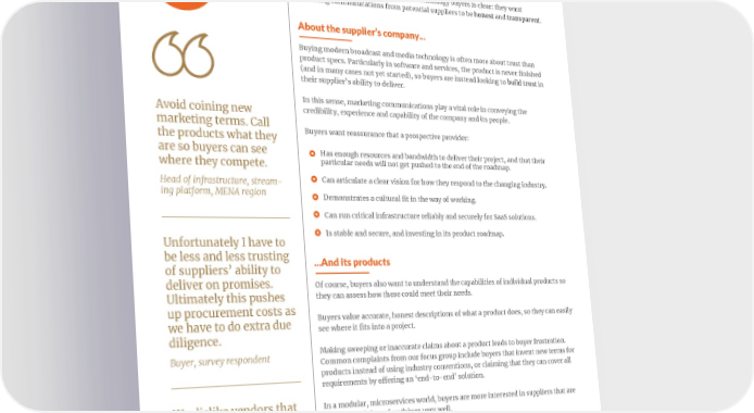 IN PARTNERSHIP WITH MARKETING MEDIA TECHNOLOGY Focusing the message The request from broadcast and media technology buyers is clear: they want 02. marketing communications from potential suppliers to be honest and transparent. About the supplier’s company... Buying modern broadcast and media technology is often more about trust than product specs. Particularly in software and services, the product is never finished (and in many cases not yet started), so buyers are instead looking to build trust in their supplier’s ability to deliver. In this sense, marketing communications play a vital role in conveying the credibility, experience and capability of the company and its people. Avoid coining new marketing terms. Call the products what they Buyers want reassurance that a prospective provider: are so buyers can see Has enough resources and bandwidth to deliver their project, and that their particular needs will not get pushed to the end of the roadmap. where they compete. Head of infrastructure, stream- Can articulate a clear vision for how they respond to the changing industry. ing platform, MENA region Demonstrates a cultural fit in the way of working. Can run critical infrastructure reliably and securely for SaaS solutions. Is stable and secure, and investing in its product roadmap. Unfortunately I have to be less and less trusting ...And its products of suppliers’ ability to deliver on promises. Of course, buyers also want to understand the capabilities of individual products so they can assess how these could meet their needs. Ultimately this pushes up procurement costs as Buyers value accurate, honest descriptions of what a product does, so they can easily we have to do extra due see where it fits into a project. diligence. Buyer, survey respondent Making sweeping or inaccurate claims about a product leads to buyer frustration. Common complaints from our focus group include buyers that invent new terms for products instead of using industry conventions, or claiming that they can cover all requirements by o昀昀ering an ‘end-to-end’ solution. We dislike vendors that In a modular, microservices world, buyers are more interested in suppliers that are are misrepresenting focused on doing a few things very well. their abilities and jumping on industry Pilots, proofs of content (PoCs) and loan equipment are an increasingly important part of this process. In SaaS, customers increasingly expect to be able to try out a product with minimal initial cost and no commitment. Product marketers can learn bandwagons. Buyer, survey respondent from the strategies of consumer SaaS businesses, and the role of the ‘free tier’. And with many SaaS products and public cloud providers moving to transparent pricing, there is pressure for more specialist broadcast and media technology suppliers to follow suit and move away from the opaque ‘enterprise pricing’ models of old.