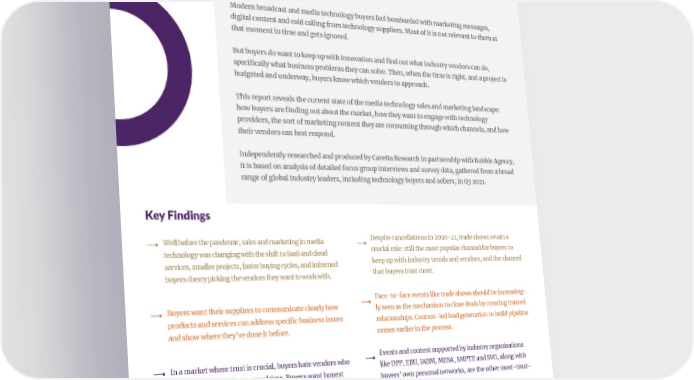 IN PARTNERSHIP WITH MARKETING MEDIA TECHNOLOGY Executive Summary Modern broadcast and media technology buyers feel bombarded with marketing messages, digital content and cold calling from technology suppliers. Most of it is not relevant to them at that moment in time and gets ignored. But buyers do want to keep up with innovation and find out what industry vendors can do, specifically what business problems they can solve. Then, when the time is right, and a project is budgeted and underway, buyers know which vendors to approach. This report reveals the current state of the media technology sales and marketing landscape: ow buyers are finding out about the market, how they want to engage with technology h providers, the sort of marketing content they are consuming through which channels, and how their vendors can best respond. Independently researched and produced by Caretta Research in partnership with Bubble Agency, it is based on analysis of detailed focus group interviews and survey data, gathered from a broad range of global industry leaders, including technology buyers and sellers, in Q3 2021. Key Findings Despite cancellations in 2020-21, trade shows retain a Well before the pandemic, sales and marketing in media crucial role: still the most popular channel for buyers to technology was changing with the shift to SaaS and cloud keep up with industry trends and vendors, and the channel services, smaller projects, faster buying cycles, and informed that buyers trust most. buyers cherry picking the vendors they want to work with. Face-to-face events like trade shows should be increasing- Buyers want their suppliers to communicate clearly how ly seen as the mechanism to close deals by creating trusted products and services can address specific business issues relationships. Content-led lead generation to build pipeline and show where they’ve done it before. comes earlier in the process. Events and content supported by industry organisations In a market where trust is crucial, buyers hate vendors who like DPP, EBU, IABM, MESA, SMPTE and SVG, along with make over-inflated or vague claims. Buyers want honest buyers’ own personal networks, are the other most-trust- and transparent marketing communications. ed sources of industry information. Marketing needs to be two-way. Listening is as important Clear, concise bite-size content across a range of formats and channels, particularly LinkedIn and YouTube, is the as broadcasting the message. Buyers feel that many best route to reach buyers who want to keep up with the suppliers fail to understand their real business needs. market and research individual suppliers. Technology suppliers following these steps, and using marketing to clearly position their specific capabilities and Beyond the explosion of digital content, face-to-face experience of solving specific business challenges will be in interactions remain crucial for building a buyer’s trust in prime place when buyers are creating a shortlist. the supplier’s ability to deliver what they’re promising.