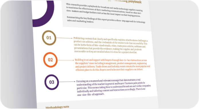 IN PARTNERSHIP WITH MARKETING MEDIA TECHNOLOGY A modern media technology marketing playbook This research provides a playbook for broadcast and media technology suppliers wanting to maximise the e昀昀ectiveness of their marketing communications, based on what deci- sion-makers and budget holders told us has the most impact on their buying process. Summarising the key findings of this report provides a three-step approach for technology sales and marketing leaders: 01 Publishing content that clearly and specifically explains what business challenges a product can address, and the credentials of the vendor to do that successfully. This can be in the form of bite-sized emails, video, trade press articles, webinars and presentations that provide the evidence, making the supplier and products memorable so they are recalled when it is time for a project shortlist. 02 Building trust and rapport with buyers through face-to-face interactions across the suppliers’ team including management, product management, engineering and project delivery. Trade shows and industry events remain the most popular and e昀케cient place to do this. Buyers need to be sure their suppliers can deliver. 03 Focusing on a nuanced and relevant message that demonstrates a real understanding of the market in general and buyers’ business pain points in particular. This means taking time to understand broadcast and media companies individually and tailoring content and interactions accordingly. There is no one-size-fits-all approach. Methodology note Independent research and analysis was carried out by Caretta Research in September and October 2021. Based on in-depth semi-structured focus group interviews with a sample of broadcast and media technology decision makers, focused on their approach to understanding the market and engaging with vendors. And an online survey aimed at both media technology buyers and sellers, with corresponding questions to each. This survey was open for three weeks, publicised via email and social media, attracting 192 responses. Buyer respondents’ companies included broadcasters, OTT platforms, pay-TV providers, telecoms providers and post-production providers. Seller respondents’ companies included software providers, hardware providers, cloud/SaaS providers, managed service providers, resellers and systems integrators. Individual respondents were primarily in senior management and technology (buyers) or marketing (sellers) leadership roles. Survey respondents were self-selecting, and may not be fully representative of the entire industry. As such all data points in this report should be regarded as indicative of overall market trends rather than as a definitive measure.