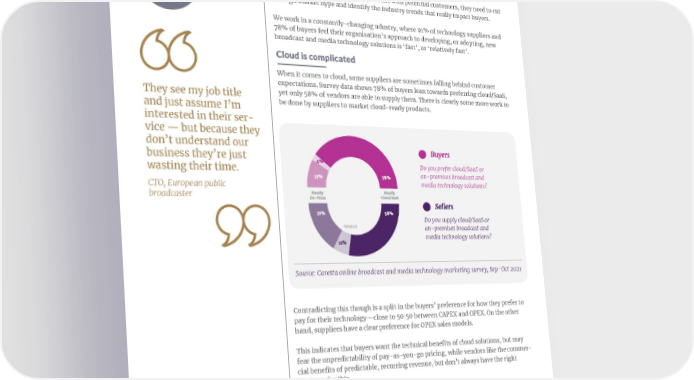 IN PARTNERSHIP WITH MARKETING MEDIA TECHNOLOGY Reflecting the pace of industry change 05. If technology suppliers are to stay in tune with potential customers, they need to cut through market hype and identify the industry trends that really impact buyers. We work in a constantly-changing ndustry, where 91% of technology suppliers and 78% of buyers feel their organisation’s approach to developing, or adopting, new broadcast and media technology solutions is ‘fast’, or ‘relatively fast’. Cloud is complicated When it comes to cloud, some suppliers are sometimes falling behind customer expectations. Survey data shows 78% of buyers lean towards preferring cloud/SaaS, They see my job title yet only 58% of vendors are able to supply them. There is clearly some more work to be done by suppliers to market cloud-ready products. and just assume I’m interested in their ser- vice — but because they don’t understand our business they’re just Do you prefer cloud/SaaS or wasting their time. on-premises broadcast and CTO, European public media technology solutions? broadcaster Do you supply cloud/SaaS or Neutral on-premises broadcast and media technology solutions? Source: Caretta online broadcast and media technology marketing survey, Sep-Oct 2021 Contradicting this though is a split in the buyers’ preference for how they prefer to pay for their technology—close to 50:50 between CAPEX and OPEX. On the other hand, suppliers have a clear preference for OPEX sales models. This indicates that buyers want the technical benefits of cloud solutions, but may fear the unpredictability of pay-as-you-go pricing, while vendors like the commer- cial benefits of predictable, recurring revenue, but don’t always have the right products for this. The lesson for product marketers is to promote a portfolio that includes cloud-native solutions with flexible ways to pay for them. And nuanced messaging that separately considers the technology and commercial implications of cloud.