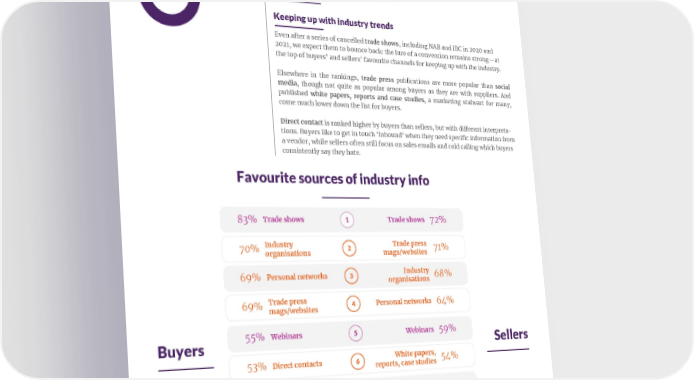 IN PARTNERSHIP WITH MARKETING MEDIA TECHNOLOGY Choosing the channels 01. Keeping up with industry trends Even after a series of cancelled trade shows, including NAB and IBC in 2020 and 2021, we expect them to bounce back: the lure of a convention remains strong—at the top of buyers’ and sellers’ favourite channels for keeping up with the industry. Elsewhere in the rankings, trade press publications are more popular than social media, though not quite as popular among buyers as they are with suppliers. And published white papers, reports and case studies, a marketing stalwart for many, come much lower down the list for buyers. Direct contact is ranked higher by buyers than sellers, but with different interpreta- tions. Buyers like to get in touch ‘inbound’ when they need specific information from a vendor, while sellers often still focus on sales emails and cold calling which buyers consistently say they hate. Favourite sources of industry info 83% Trade shows 1 Trade shows 72% 70% Industry 2 Trade press 71% organisations mags/websites 69% Personal networks 3 Industry 68% organisations 69% Trade press 4 Personal networks 64% mags/websites Buyers 55% Webinars 5 Webinars 59% Sellers 53% Direct contacts 6 White papers, 54% reports, case studies 50% Social media 7 Online search (SEO) 49% 48% Online search 8 Social Media 49% 48% White papers, reports, 9 Direct Contacts 45% case studies 32% Paid-for research 10 Paid-for research 25% Respondents ranked channels in order of which they most like to use. Aggregated popularity metric.