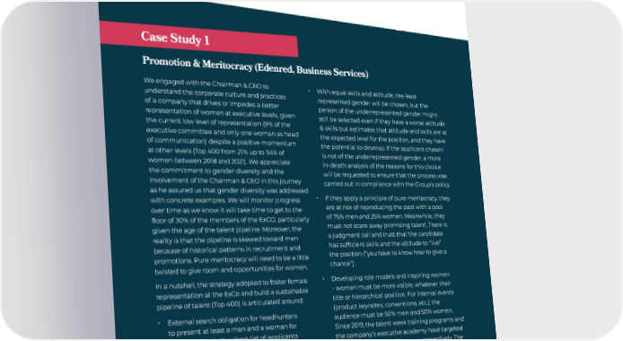 2022 Annual Report 14 30% Club France Investor Group Sharing Best Practices Please find a few examples of the best practices we observed on the different pillars that were identified as evidence of a genuine strategy toward gender equity. Promotion & Meritocracy (Edenred, Business Services) We engaged with the Chairman & CEO to understand the corporate culture and practices of a company that drives or impedes a better representation of women at executive levels, given the current low level of representation (9% of the executive committee and only one woman as head of communication) despite a positive momentum at other levels (Top 400 f rom 21% up to 34% of women between 2018 and 2021). We appreciate the commitment to gender diversity and the involvement of the Chairman & CEO in this journey as he assured us that gender diversity was addressed with concrete examples. We will monitor progress over time as we know it will take time to get to the floor of 30% of the members of the ExCO, particularly given the age of the talent pipeline. Moreover, the reality is that the pipeline is skewed toward men because of historical patterns in recruitment and promotions. Pure meritocracy will need to be a little twisted to give room and opportunities for women. In a nutshell, the strategy adopted to foster female representation at the ExCo and build a sustainable pipeline of talent (Top 400) is articulated around: • External search obligation for headhunters to present at least a man and a woman for each position in the short-list of applicants - a requirement not easy to fulfill and time- consuming. • Internally, this gender-balanced approach is much more complicated to apply. It would be counterproductive to scare away talents that have developed over time within the firm and have contributed to corporate success. As such, the CEO is the arbiter and oversees recruitment for the Top 400 positions (now filled with 34% women). It’s a collegial process. • With equal skills and attitude, the least represented gender will be chosen, but the person of the underrepresented gender might still be selected even if they have a worse attitude & skills but estimates that attitude and skills are at the expected level for the position, and they have the potential to develop. If the applicant chosen is not of the underrepresented gender, a more in-depth analysis of the reasons for this choice will be requested to ensure that the process was carried out in compliance with the Group’s policy. • If they apply a principle of pure meritocracy, they are at risk of reproducing the past with a pool of 75% men and 25% women. Meanwhile, they must not scare away promising talent. There is a judgment call and trust that the candidate has sufficient skills and the attitude to “live” the position (“you have to know how to give a chance”). • Developing role models and inspiring women - women must be more visible, whatever their title or hierarchical position. For internal events (product keynotes, conventions, etc.), the audience must be 50% men and 50% women. Since 2019, the talent week training programs and the company’s executive academy have targeted at least 40% and 35% of women, respectively. The company put in place a coaching program for women (mentors for one year chosen among the management team) but also mandatory trainings on diversity and inclusion, unconscious bias, and ways of fighting the tendency to self-censorship in monthly meetings. Case Study 1