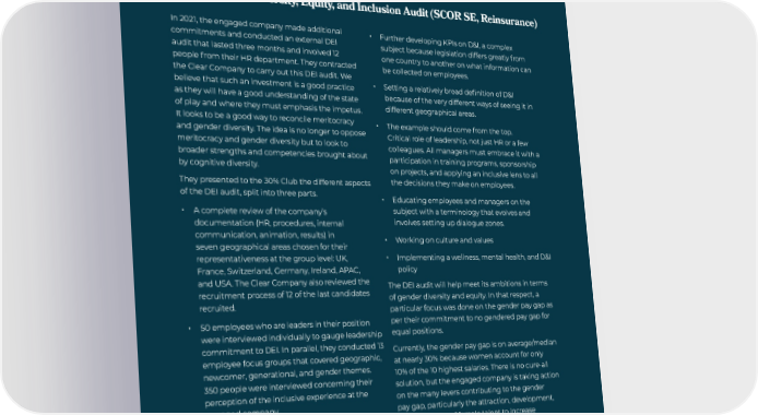 2022 Annual Report 16 30% Club France Investor Group The Merits of a Diversity, Equity, and Inclusion Audit (SCOR SE, Reinsurance) In 2021, the engaged company made additional commitments and conducted an external DEI audit that lasted three months and involved 12 people f rom their HR department. They contracted the Clear Company to carry out this DEI audit. We believe that such an investment is a good practice as they will have a good understanding of the state of play and where they must emphasis the impetus. It looks to be a good way to reconcile meritocracy and gender diversity. The idea is no longer to oppose meritocracy and gender diversity but to look to broader strengths and competencies brought about by cognitive diversity. They presented to the 30% Club the different aspects of the DEI audit, split into three parts. • A complete review of the company’s documentation (HR, procedures, internal communication, animation, results) in seven geographical areas chosen for their representativeness at the group level: UK, France, Switzerland, Germany, Ireland, APAC, and USA. The Clear Company also reviewed the recruitment process of 12 of the last candidates recruited. • 50 employees who are leaders in their position were interviewed individually to gauge leadership commitment to DEI. In parallel, they conducted 13 employee focus groups that covered geographic, newcomer, generational, and gender themes. 350 people were interviewed concerning their perception of the inclusive experience at the engaged company. • Positioning of the engaged company by the Clear Company relative to its industry peers. The Consulting Firm formulated recommendations in terms of Diversity, Equity, and Inclusion. • Communication of the D&I strategy to all employees with clear objectives. • Further developing KPIs on D&I, a complex subject because legislation differs greatly f rom one country to another on what information can be collected on employees. • Setting a relatively broad definition of D&I because of the very different ways of seeing it in different geographical areas. • The example should come f rom the top. Critical role of leadership, not just HR or a few colleagues. All managers must embrace it with a participation in training programs, sponsorship on projects, and applying an inclusive lens to all the decisions they make on employees. • Educating employees and managers on the subject with a terminology that evolves and involves setting up dialogue zones. • Working on culture and values • Implementing a wellness, mental health, and D&I policy The DEI audit will help meet its ambitions in terms of gender diversity and equity. In that respect, a particular focus was done on the gender pay gap as per their commitment to no gendered pay gap for equal positions. Currently, the gender pay gap is on average/median at nearly 30% because women account for only 10% of the 10 highest salaries. There is no cure-all solution, but the engaged company is taking action on the many levers contributing to the gender pay gap, particularly the attraction, development, and promotion of female talent to increase representation in the highest pay groups. A tangible example is the mapping of all the roles in the organization, seen as the opportunity to have a more granular monitoring of the situation, e.g., which jobs are occupied by women, for which hierarchical roles, and at which wages. What gets monitored gets measured and improved with the end purpose of ensuring fair compensation for employees, whatever their gender. Case Study 3