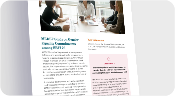 2022 Annual Report 12 30% Club France Investor Group MEDEF Study on Gender Equality Commitments among SBF120 MEDEF is the leading network of entrepreneurs in France and a social partner for entrepreneurs helping to establish social dialogue. Over 95% of MEDEF members are small- and medium-sized enterprises (SMEs) representing various economic sectors. The organization promotes entrepreneurship and defends f ree enterprise, with one of its key focuses being job creation and sustainable growth as part of the long-term economic development of businesses. Sustainable development and social aspects of businesses are among the main topics on which MEDEF is continuously working. The organization has conducted various studies and regularly sets up surveys to gather relevant information on social, sustainability, and economic trends such as the socio-eco impact of digitalization, employment of disabled people, employee health & safety, and diversity & inclusion. Gender diversity continued to be one of the priority topics for MEDEF in 2022. For the second consecutive year, MEDEF experts conducted a data survey to identify gender diversity (feminization) levels in the composition of SBF120 companies’ executive bodies. The survey was successful, and MEDEF kindly shared with us some of their observations. Data stand for year 2021. Key Takeaways When reviewing the data provided by MEDEF, the 30% Club France Investor Group observed three key takeaways.  Observation 1: The majority of the SBF120 have targets on gender diversity with five new companies committing to support female leaders in 2021 The rate of disclosure is quite high with 103 out of 120 companies having published information on gender diversity as regards the composition of their governing bodies. Moreover, 97 responding companies (versus 92 last year) have already published commitments and targets to increase gender diversity among their governing bodies. Six of the responding companies still have no gender diversity targets with two of them having zero women in governing bodies at the end of 2021 and two others not disclosing this information at all. We hope to see further improvements in the near future, with all SBF120 companies setting and reinforcing gender diversity targets.